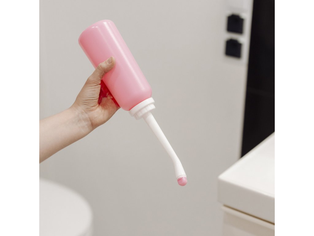 1. Na toaletě nalijte do lahve teplou vodu a pevně zašroubujte uzávěr. Pro pohodlnou aplikaci má lahev dvě koncovky s různými úhly trysek.