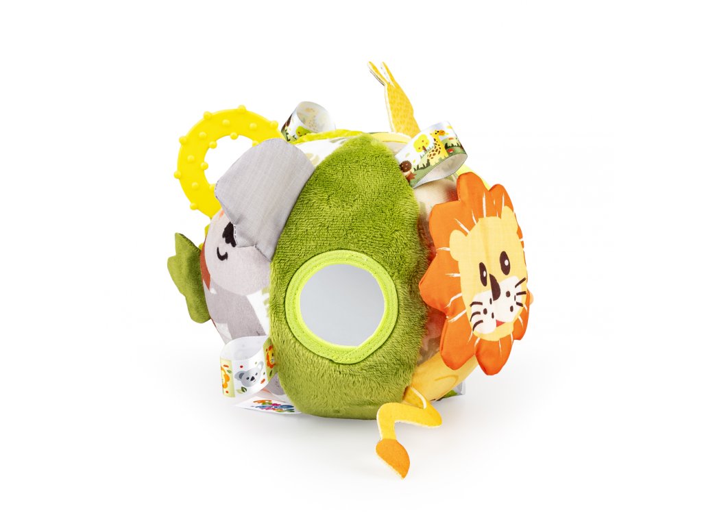 Prozkoumejte svět divoké zvěře v přátelském a plyšovém prostředí! Barevný míč zdobený třemi roztomilými zvířátky poskytne nejmladším zábavu a rozvojové potěšení. Na malé uličníky čeká mnoho smyslových překvapení: šustící zvířecí prvky (hlava lva a ocas veverky), vrzající koalino ucho, pohyblivé kroužky pro posouvání, přišité štítky a různé textury materiálů. Na stěně míče najde vaše dítě také bezpečné zrcátko pro sebepoznávání a uvnitř něj - skrytý zvonek, který vydává krásný zvuk, když se s míčem zatřese.