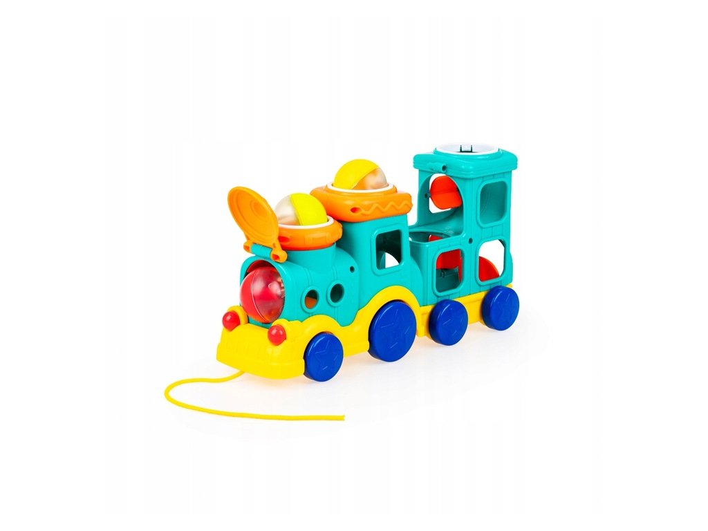 Tento barevný ruční vláček má spoustu okének a otočných prvků pro pohyb prstů. Sada obsahuje tři kuličky a kladivo, kterým je zatloukáte do otvorů. Objevte s vláčkem Ťuk-ťuk souvislosti příčiny a následku a sledujte, kam kulička dopadne, když ji narazíte do komína nebo střechy vagónu. Jakmile si s kuličkami dohrajete, chyťte se provázku a projeďte se s vláčkem, který veďte za sebou!