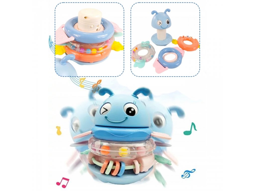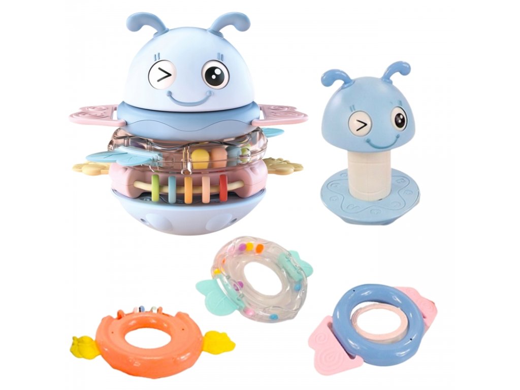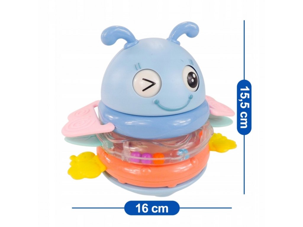 Hrnek Woopie 2 v 1 Blue Bee Tumbler je multifunkční senzorická hračka , která potěší jak svou funkčností, tak vzhledem! Kombinuje chrastítka a kousátka se zvukovými efekty a poskytuje vašemu dítěti všestrannou hru a podporuje jeho vývoj od prvních měsíců života. Tři barevné kroužky, které fungují jako chrastítka i kousátka , lze připevnit na speciální kolíček, který v závislosti na zvoleném režimu přehraje písničku nebo vydá zábavný zvuk. Okouzlující včelí hlava s pohyblivýma očima dotváří vzhled a vytváří atraktivní tvar, který upoutá pozornost dítěte. Tato hračka byla navržena s ohledem na nejmenší děti . Jemné silikonové výstupky na kroužcích jsou ideální jako kousátka , zatímco bezpečné, zaoblené tvary umožňují snadné uchopení a manipulaci. Všechny dílky jsou barevné, rozmanité textury a vhodné velikosti, čímž stimulují smysly, zvědavost a motorické dovednosti vašeho dítěte . Díky zaoblené základně se hračka jemně houpá s pohybem a není snadné ji převrátit! Není to jen hračka, ale společník pro každodenní učení a rozvoj .