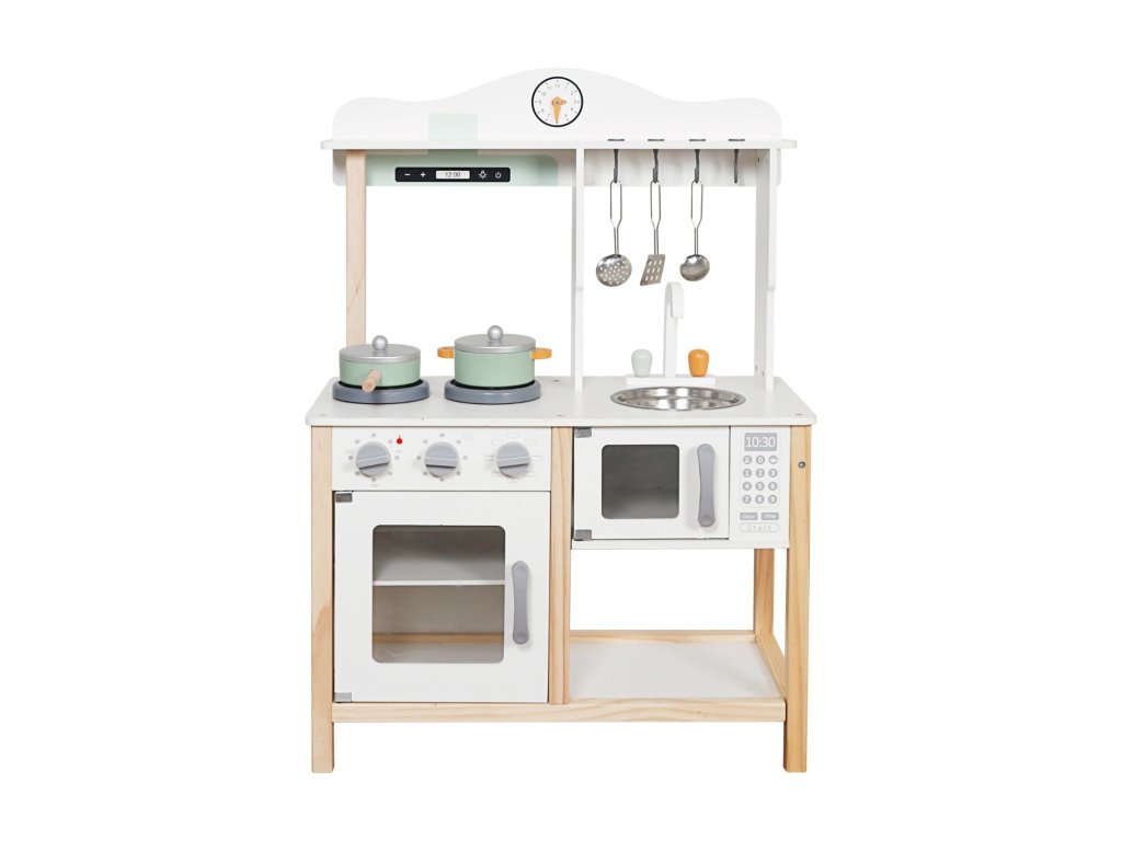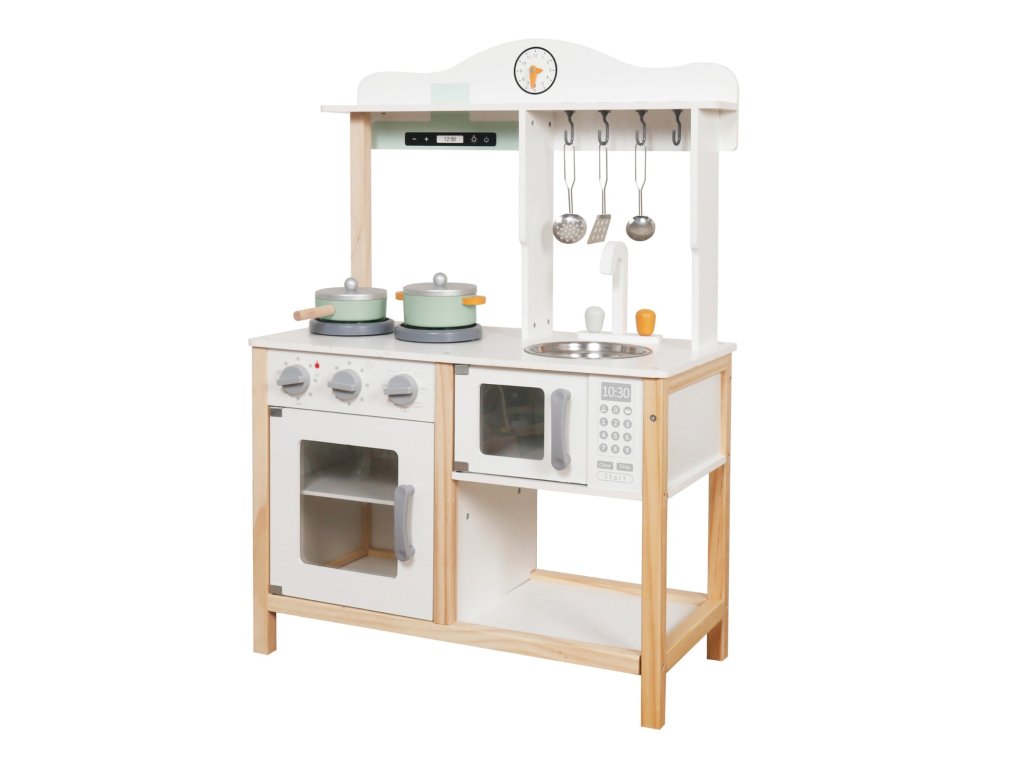 Dětská kuchyňka Baby Mix je krásná a stylová dřevěná hračka, která promění každý pokoj v malé kuchařské království. Díky svému modernímu designu v bílé barvě, realistickým detailům a kvalitnímu provedení je ideální volbou pro děti, které milují hraní rolí, vaření a napodobování dospělých.