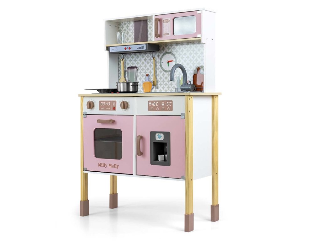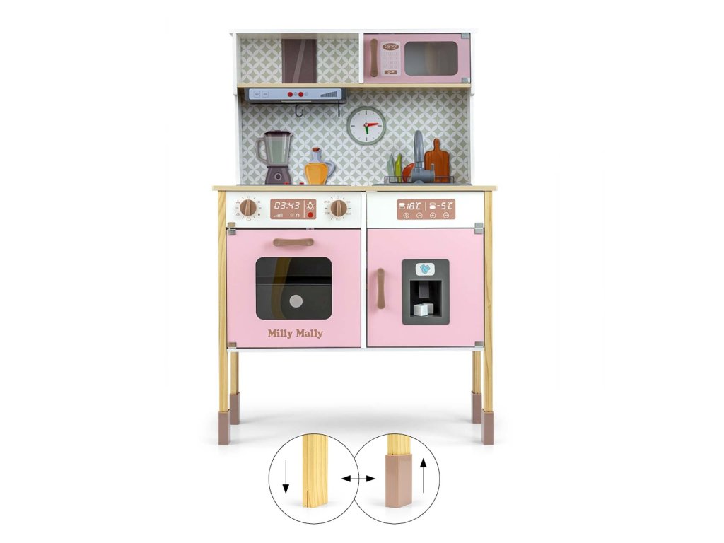 Milly Mally stavila na bohaté výbavě, která zahrnuje pánev, hrnec s poklicí a dřevěné špachtle k zavěšení pod digestoř. S pomocí této hračky se děti při hraní učí zodpovědnosti za vlastní kuchyň a úklidu. Kuchyň je výškově nastavitelná, což znamená, že roste s dítětem.