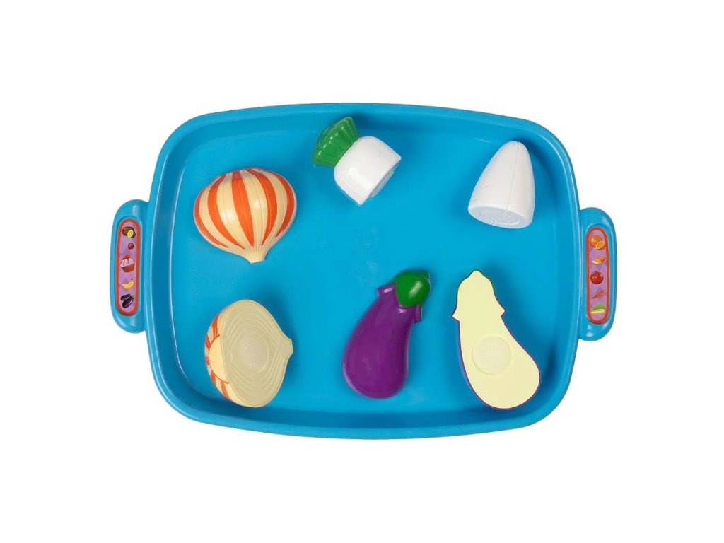 Obsahuje: Tác na servírování a aranžování zeleniny a ovoce., Krájecí nůž: S plastovou čepelí, bezpečný pro děti., Krájecí deska: Vyrobena z měkkého plastu, umožňuje bezpečné krájení.