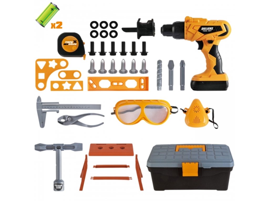 - Vlastnosti: Sada obsahuje elektrický šroubovák s vyměnitelnými bity, příslušenství, jako jsou ochranné brýle a ochranná maska , a krabičku s nářadím pro uložení