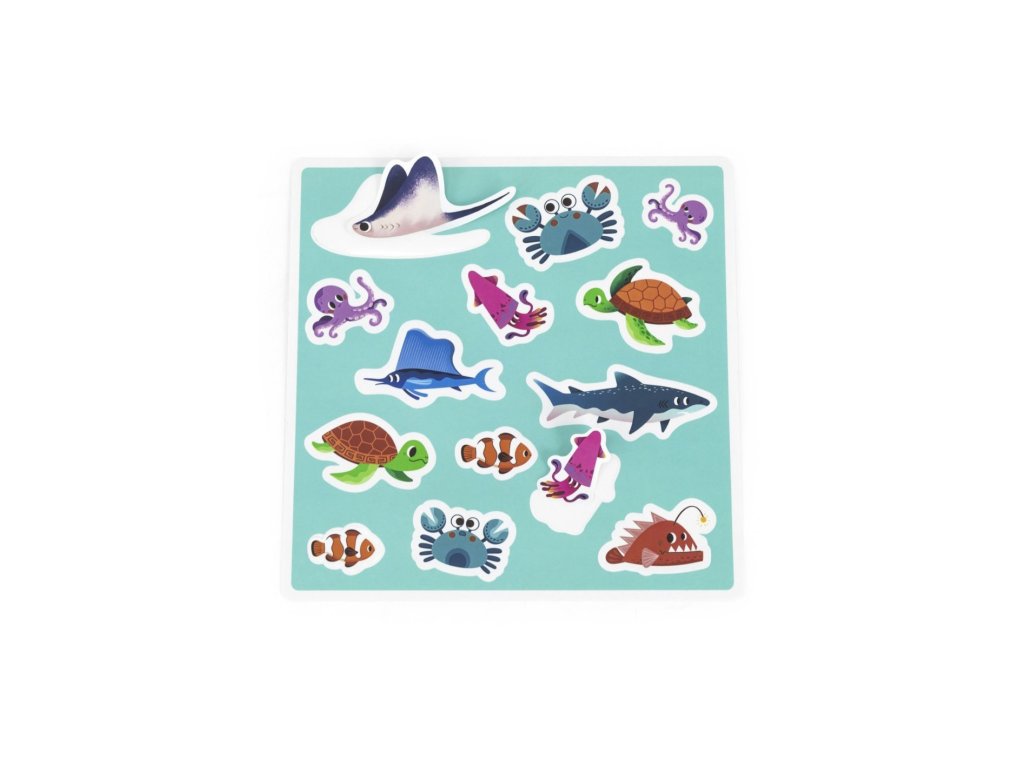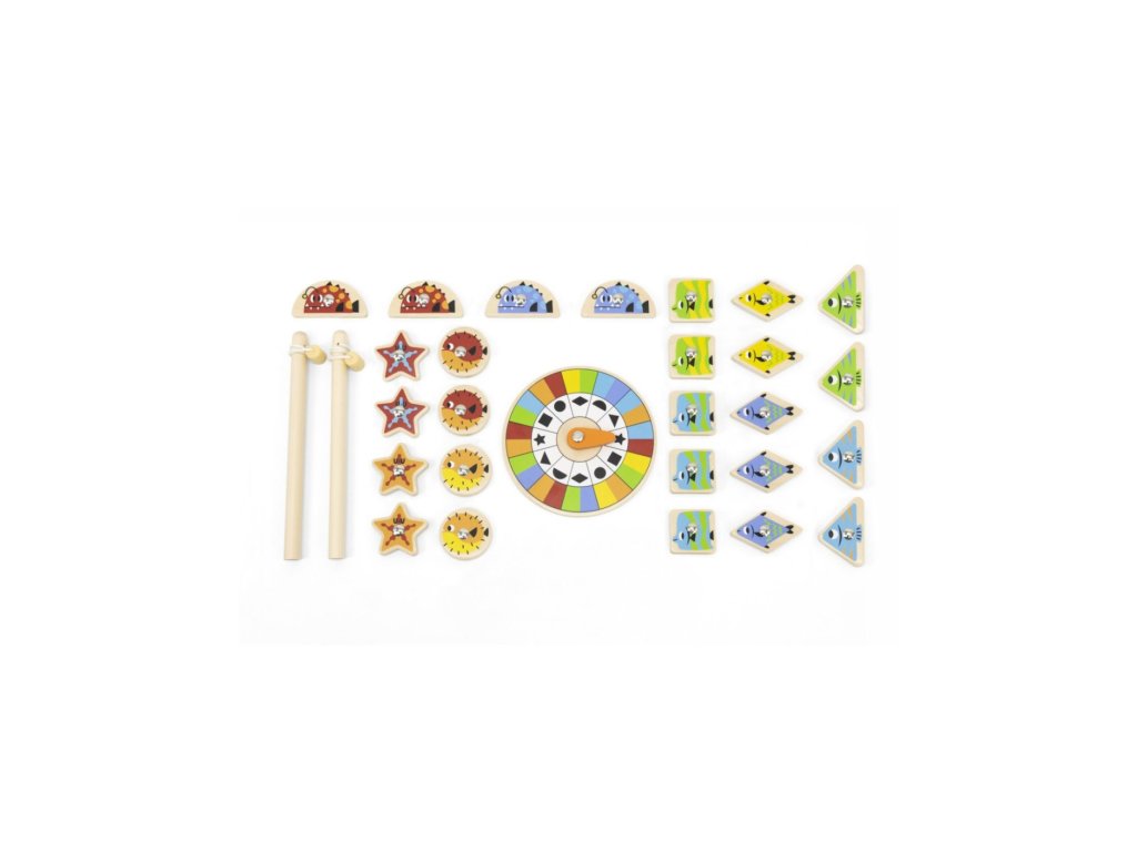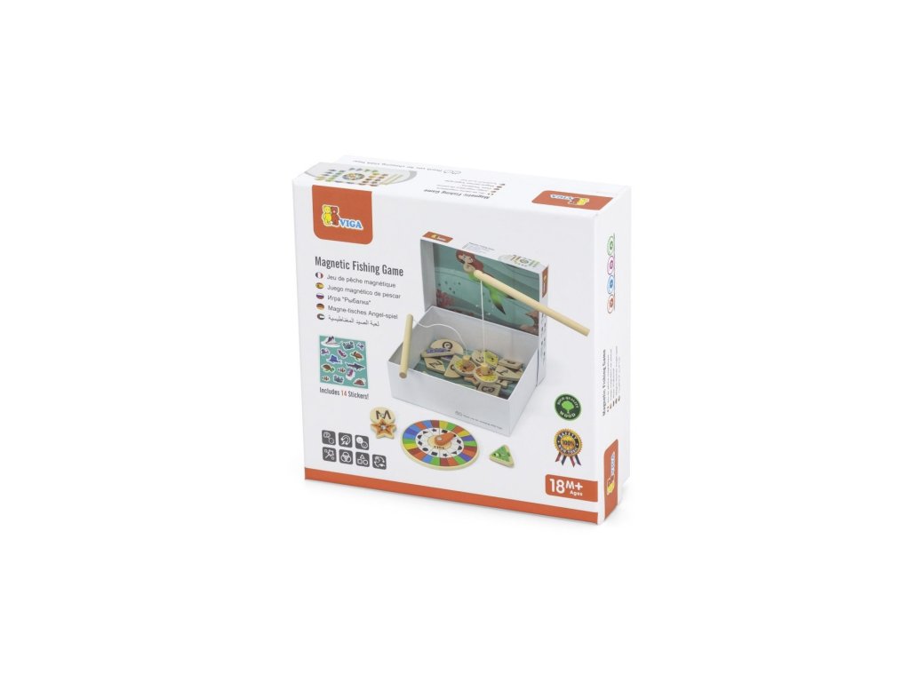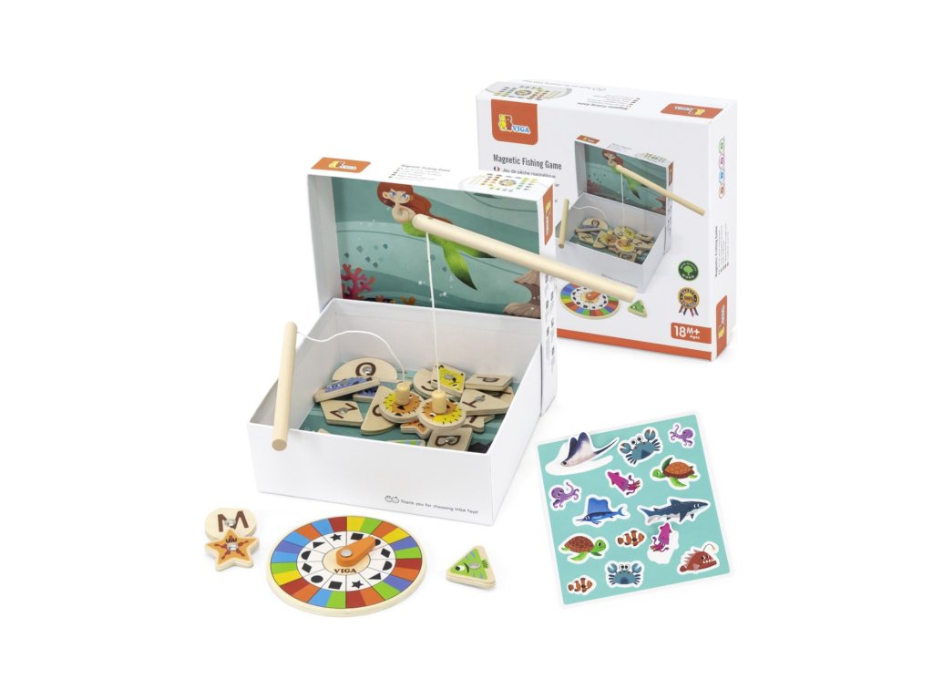 Sada obsahuje: dva magnetické rybářské pruty, otočný talíř, 26 magnetických rybiček, 14 samolepek.
