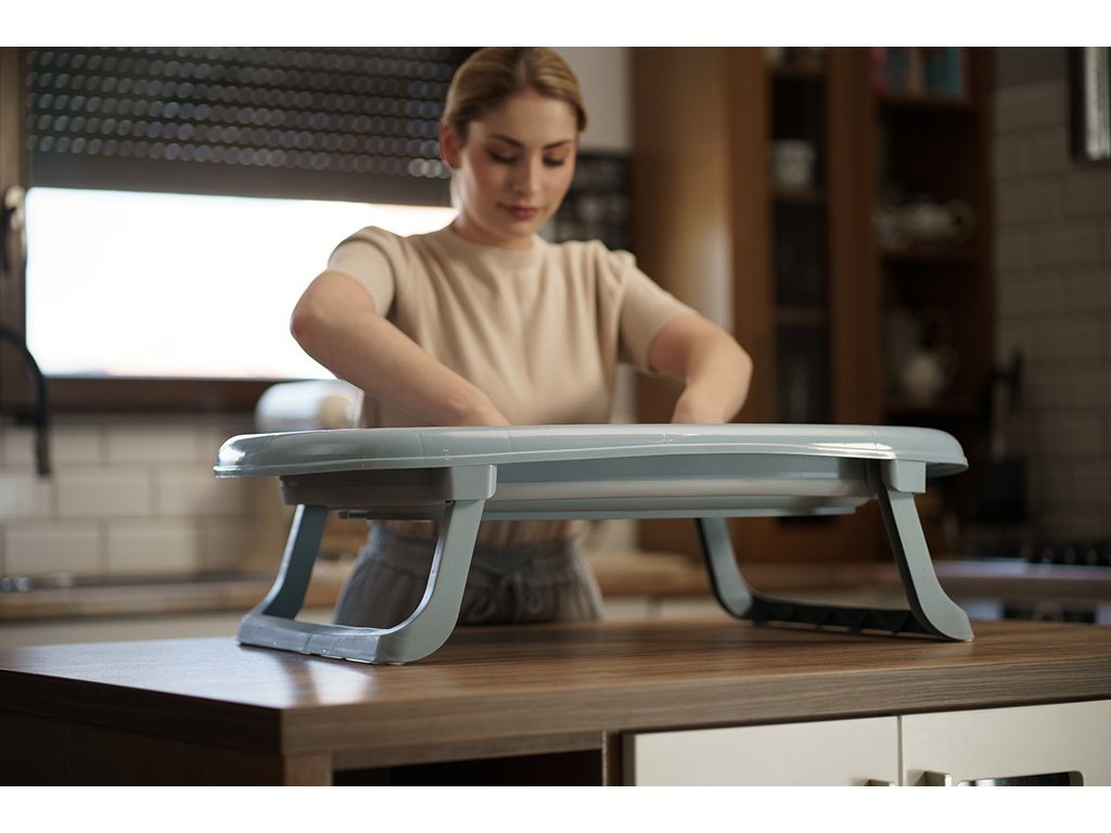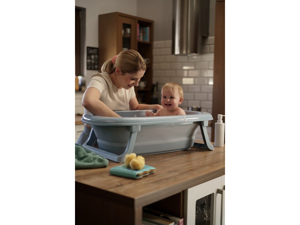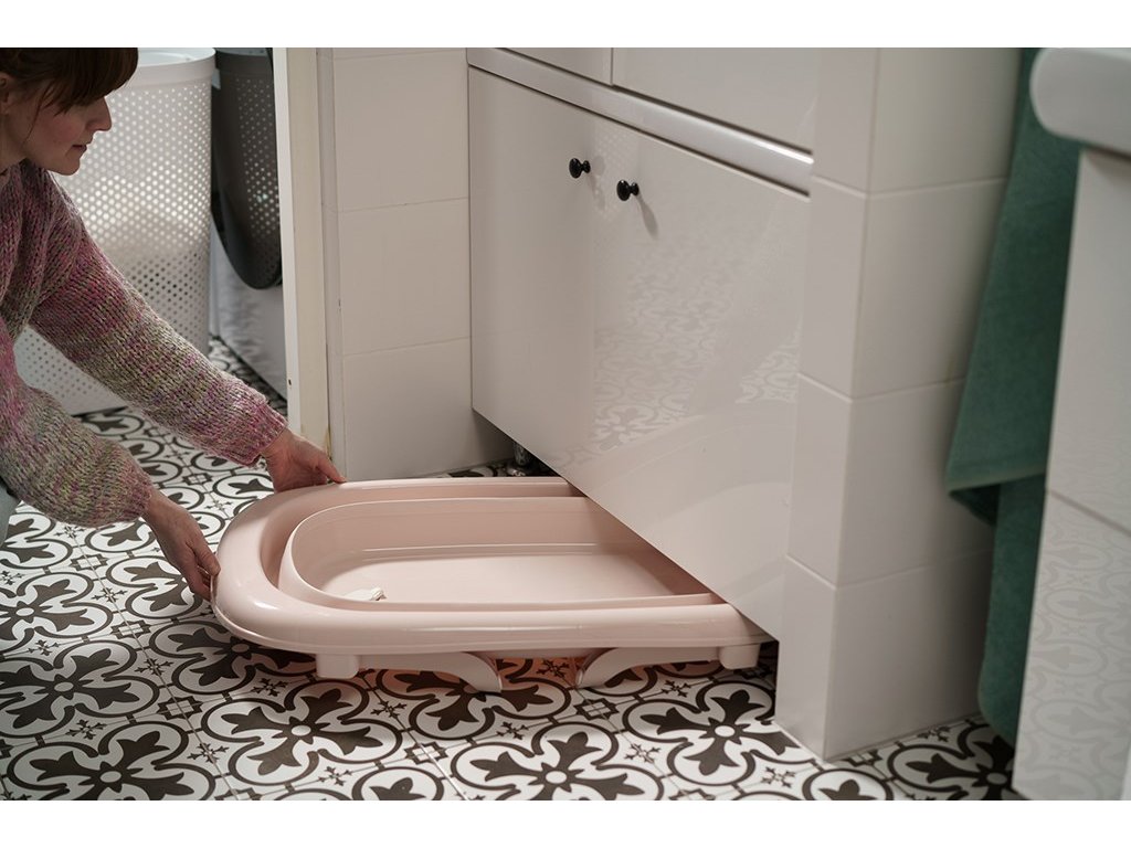 Vanička je vybavena výpustním ventilem a páskovým teploměrem, což výrazně zvyšuje komfort a bezpečnost při každodenním používání. Dá jednoduše složit na výšku pouhých 10 cm, přičemž plastové nožičky se sklopí přímo pod vaničku – díky čemuž zabírá minimum místa a je ideální pro skladování i v menších prostorách.