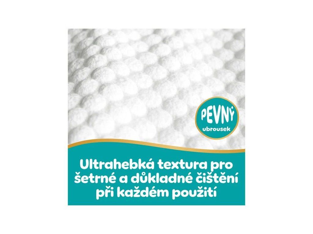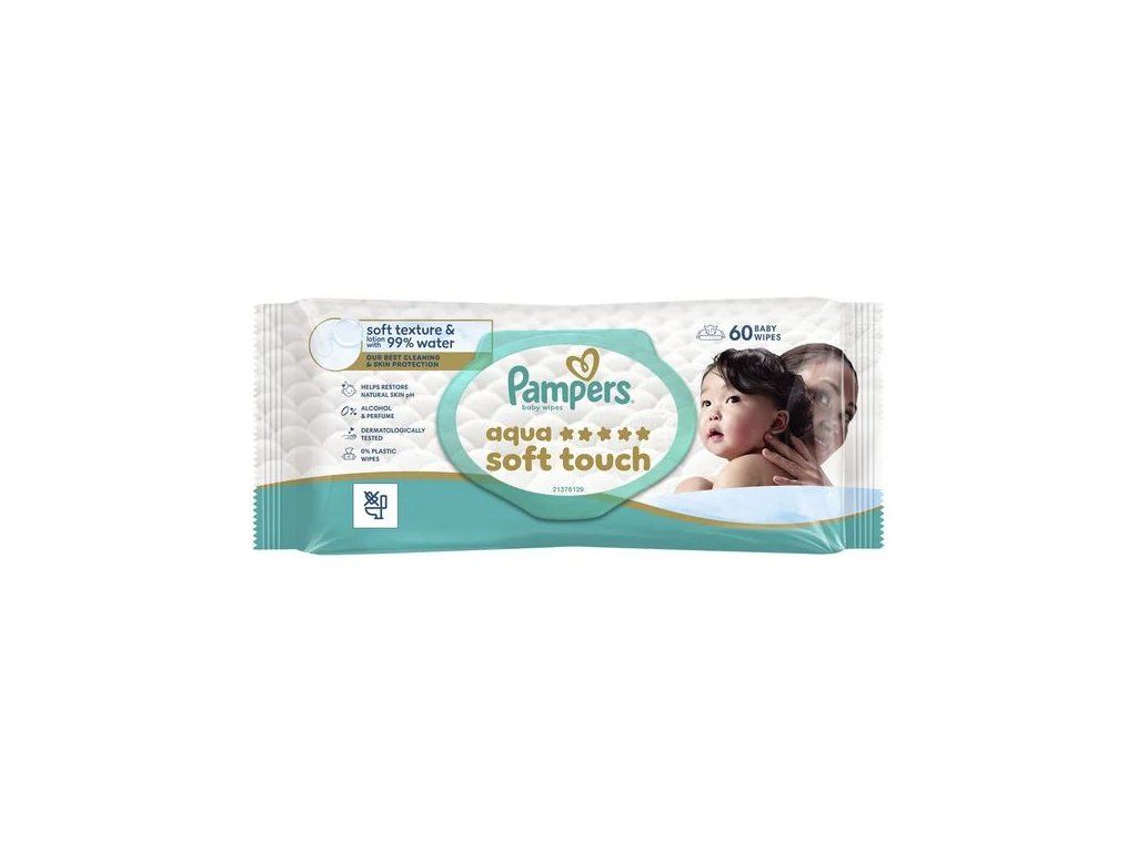 Pampers Aqua Soft Touch ubrousky s 99 % vody jemně čistí, chrání citlivou pokožku a pomáhají udržet její přirozené pH, bez alkoholu a parfemace.