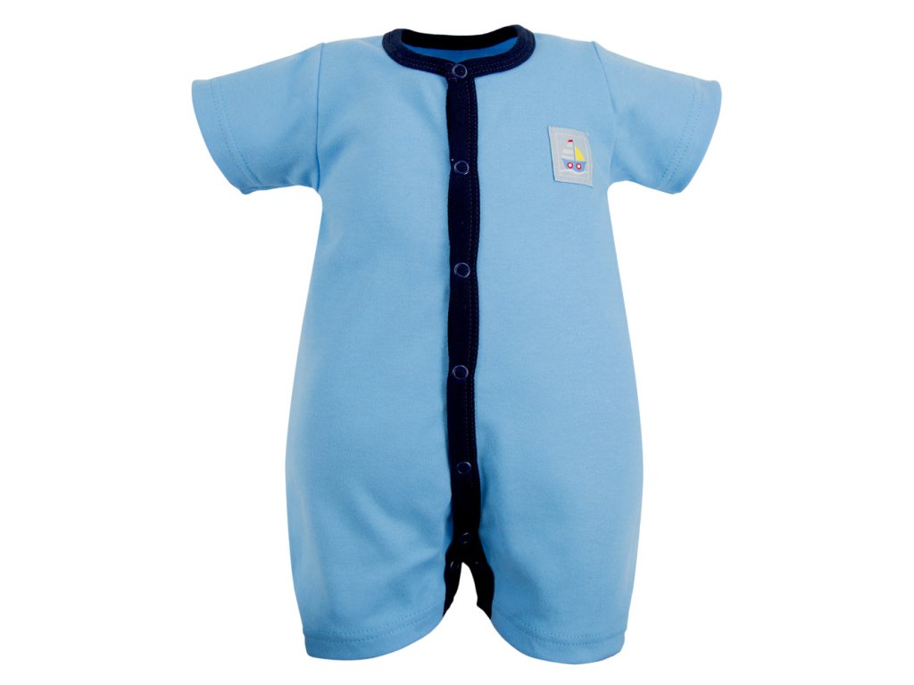 Dětský Rampers neboli letní overal z kolekce „SHIPS“ z měkkého a příjemného na dotek bavlněného materiálu s potiskem vytvořeným barvami bezpečnými pro děti.