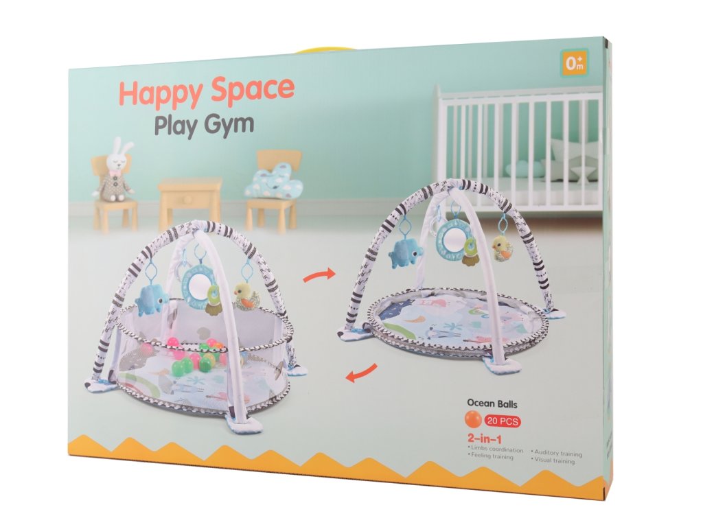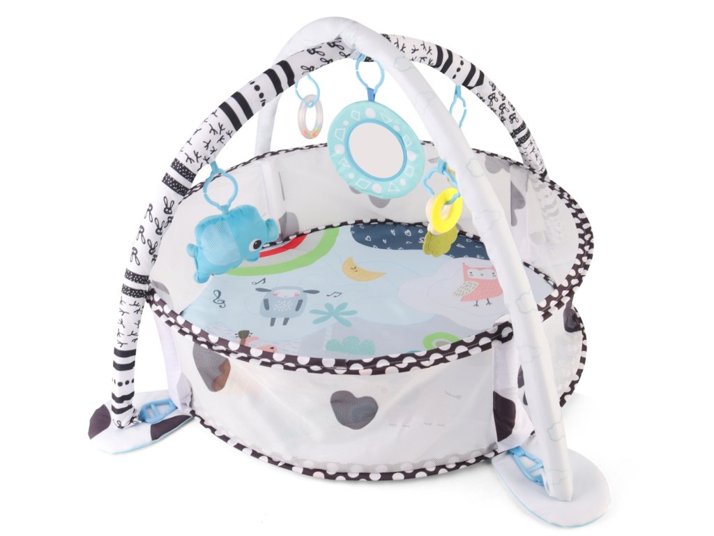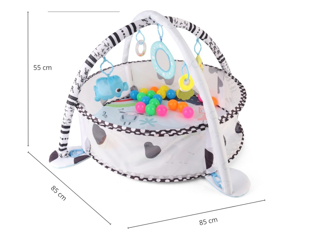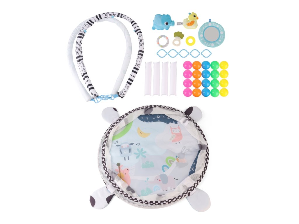 - Podložka – ohrádka/bazén s míčky - Vyvýšené stěny z prodyšné síťoviny přeměňují podložku na bezpečný mini-bazén naplněný 20 barevnými míčky (součástí balení). Dítě si může hrát obklopeno hračkami a měkkými stěnami, které zajišťují bezpečnost a pohodlí.