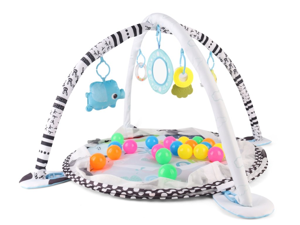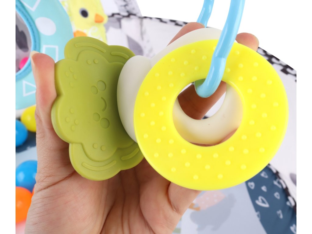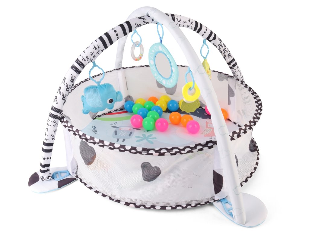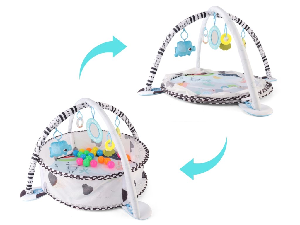 Podložka Vzdělávací podložka 2v1 Bazén s míčky je krásně navržený, vzdělávací nástroj pro rozvoj pro miminka – kombinuje zábavu, pohodlí a bezpečnost. Barevné přívěsky, snadné čištění a možnost úpravy konfigurace z něj dělají hodnotné vybavení dětského pokoje.