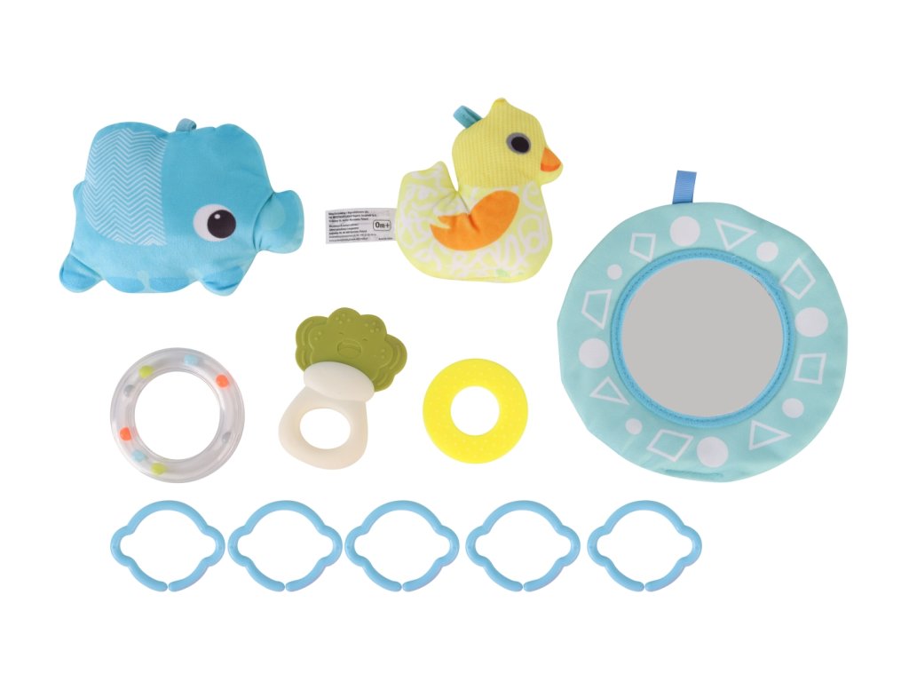 - 4 měkké hračky a chrastítka: Plyšový slon, Žlutá kačenka, Průhledná hračka s kuličkami, Kousátko a 1 senzorický kroužek