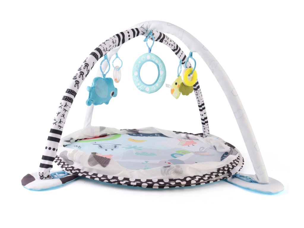 - Vzdělávací podložka s hrazdičkami - Rozložená verze – ideální pro první pokusy o ležení, točení a pozorování okolí. Hrazdičky s přívěsky stimulují smysly a rozvíjejí koordinaci zraku a pohybu.